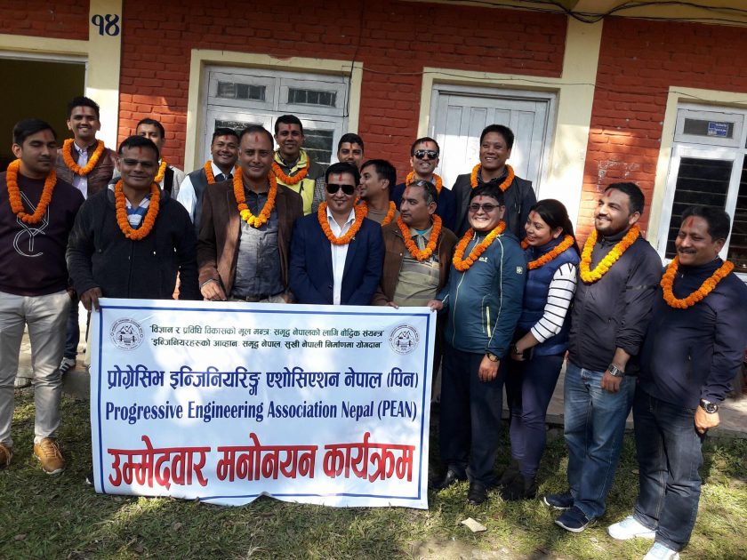नेकपा निकट प्रोग्रेसिभ इन्जिनियरिङ एसोसियसन नेपाल (पिन)बाट सभापतिमा बाबुराम भण्डारी मैदानमा छन् । उपसभापति, सचिव, सहसचिव र कोषाध्यक्षमा क्रमश ध्रुवराज भट्टराई, दीपक थापा, विष्णुप्रसाद खनाल, र सोबितबहादुर क्षेत्री उम्मेदवार छन् ।