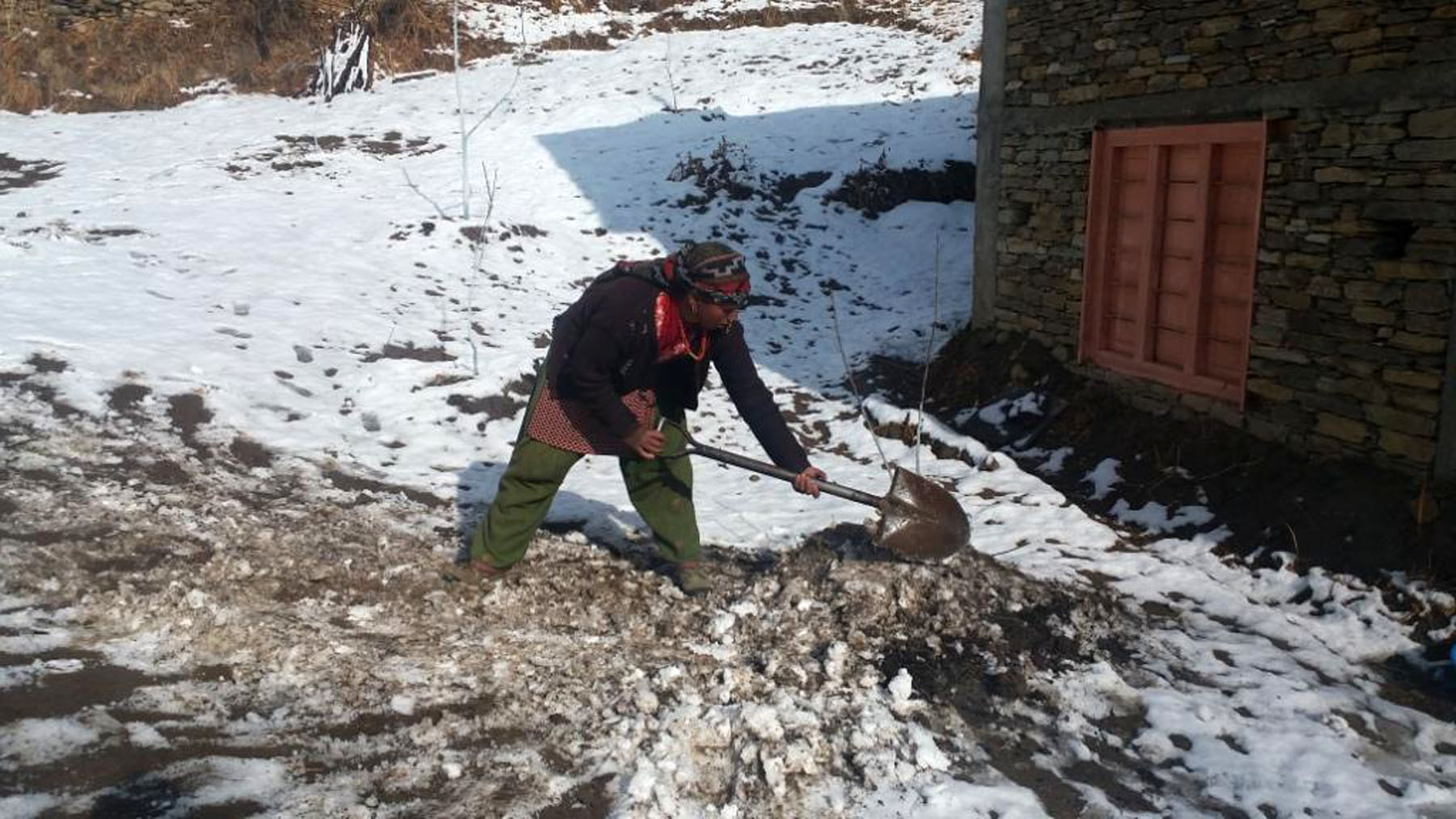 स्याउँका बिरुवा वारिपति हिउँ थुपार्दै कृषक