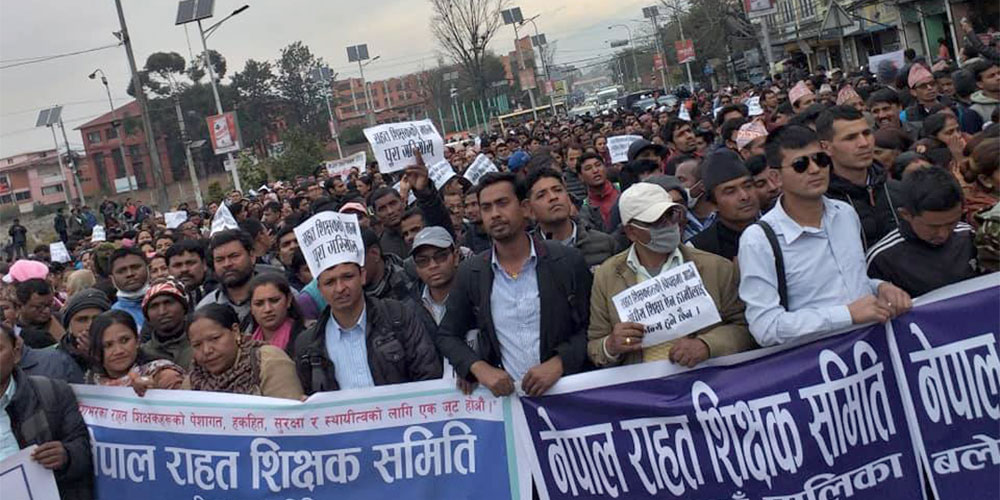 आफूहरूलाई स्वत: स्थायी हुने व्यवस्था प्रस्तावित शिक्षा ऐनमा राख्न माग गर्दै दुई दिनदेखि शिक्षकहरू राजधानीमा आन्दोलनमा छन्।
