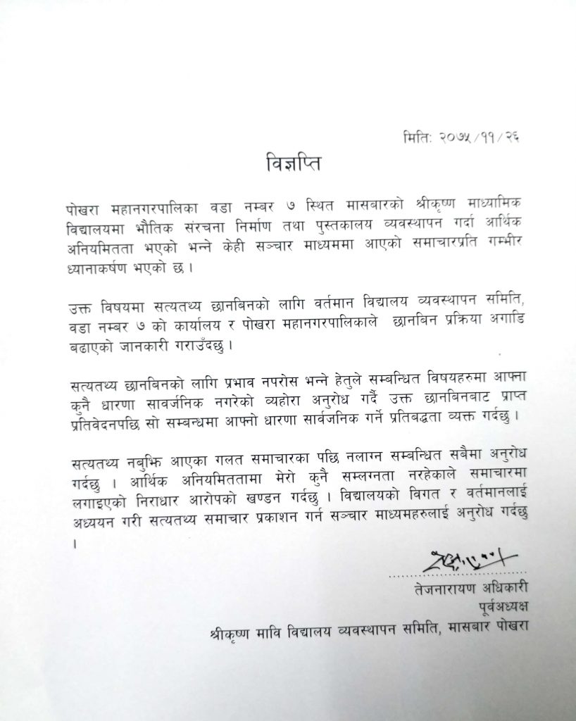 विद्यालयमा भएको अनियमितताबारे छानबिन जारी रहेका बेला पोखरा ७ मासबारको श्रीकृष्ण माध्यामिक विद्यालय व्यवस्थापन समितिका पूर्वअध्यक्ष तेजनारायण अधिकारीले विद्यालयमा आर्थिक अनियमिततामा आफ्नो संलग्ना नभएको दाबी गरेका छन् ।