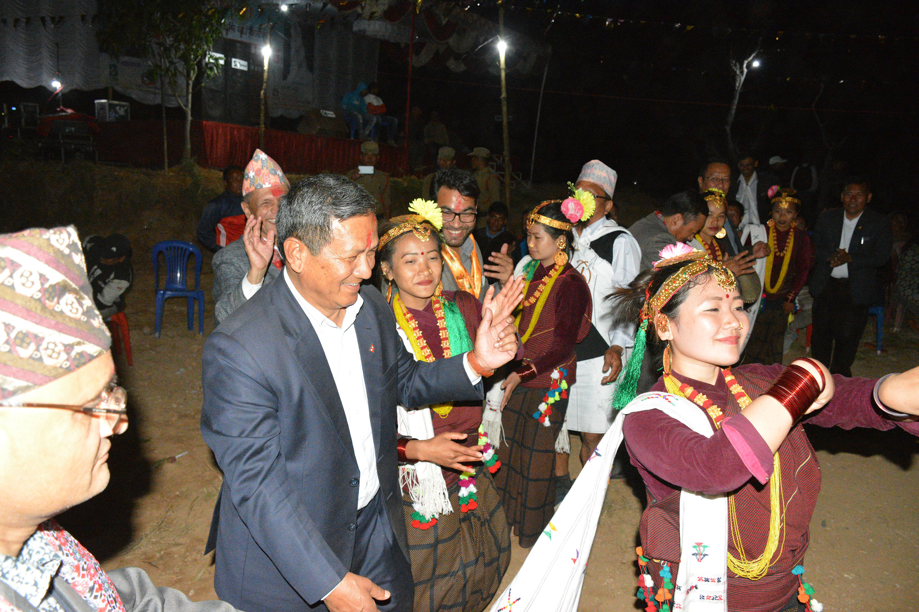 स्थानीयको स्वागत गीतसँगै मुख्यमन्त्री गुरुङ आफैँले खैजडी बजाउन थाले, गीतको तालमा नाच्न पनि । मुख्यमन्त्रीलाई साथ दिँदै आर्थिक मामिला तथा योजनामन्त्री गुरुङ, आन्तरिक मामिला तथा कानुनमन्त्री चुमान र भूमि, व्यवस्था कृषि तथा सहकारीमन्त्री थापासमेत नाच्न अगाडि बढे । मुख्यमन्त्री र मन्त्रीहरूलाई यहाँका स्थानीय युवतीले कौरा गीतमा साथ दिए ।