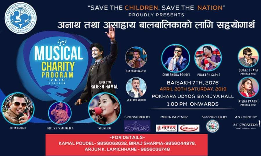 आगामी बैशाख ७ गते पोखरामा साँगीतिक कार्यक्रम हुने भएको छ । सेभ द चिल्ड्रेन र सेभ द नेसनको आयोजनामा कार्यक्रम आयोजना हुने भएको हो ।