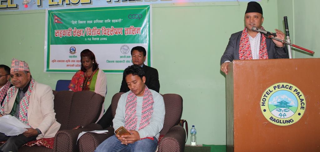 जिल्ला सहकारी संघ लिमिटेड बागलुङले गण्डकी प्रदेशको भूमि व्यवस्था, कृषि तथा सहकारी मन्त्रालयको सहयोगमा सञ्चालन गरेको एक हप्ते सहकारी लेखा तथा वित्तीय व्यवस्थापन तालिमको आइतवार उद्घाटन गर्दै उहाले यस्तो बताउनु भएको हो ।