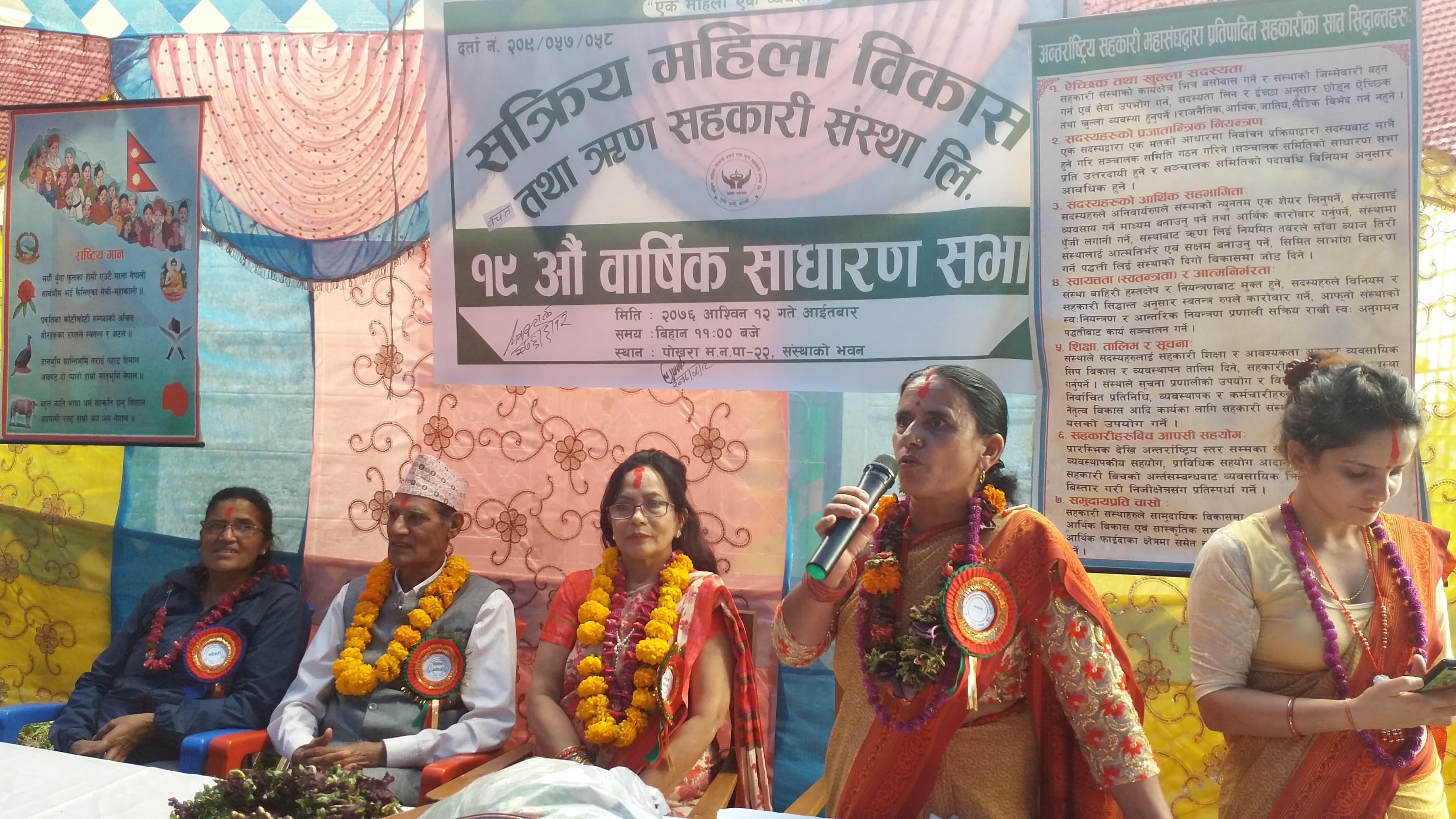 पोखरा २२ पुम्दीमा रहेको सक्रिय महिला विकास बचत तथा ऋण सहकारीको १९ औं साधारणसभा आइतबार भएको छ । सभामा प्रदेशसभा सदस्य मीना गुरुङले सार्थक श्रम गरी बचत गर्न र उत्पादनशील क्षेत्रमा लाग्न आग्रह गरिन् । उनले वडा, महानगर र प्रदेशसँग समन्वय गरी महिलालाई सशक्तीकरण र उद्यमशील बनाउने तालिम सञ्चालन गर्न उनले आग्रह गरिन् ।