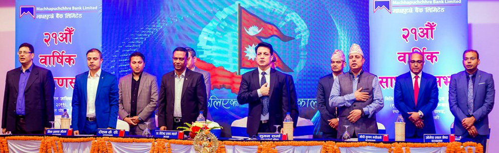 माछापुच्छ्रे बैंक लिमिटेडको २१औँं वार्षिक साधारणसभा शुक्रबार सम्पन्न भएको छ । साधारण सभाले बैंकको आर्थिक बर्ष २०७५/७६ को बार्षिक प्रतिबेदन पारित गर्नुका साथै बैंकको सञ्चालक समितिले प्रस्ताव गरे अनुसार शेयरधनीहरुलाई हालको चुक्ता पूँजीको १६ प्रतिशत लाभांश वितरण गर्ने प्रस्ताव पारित गरेको छ ।