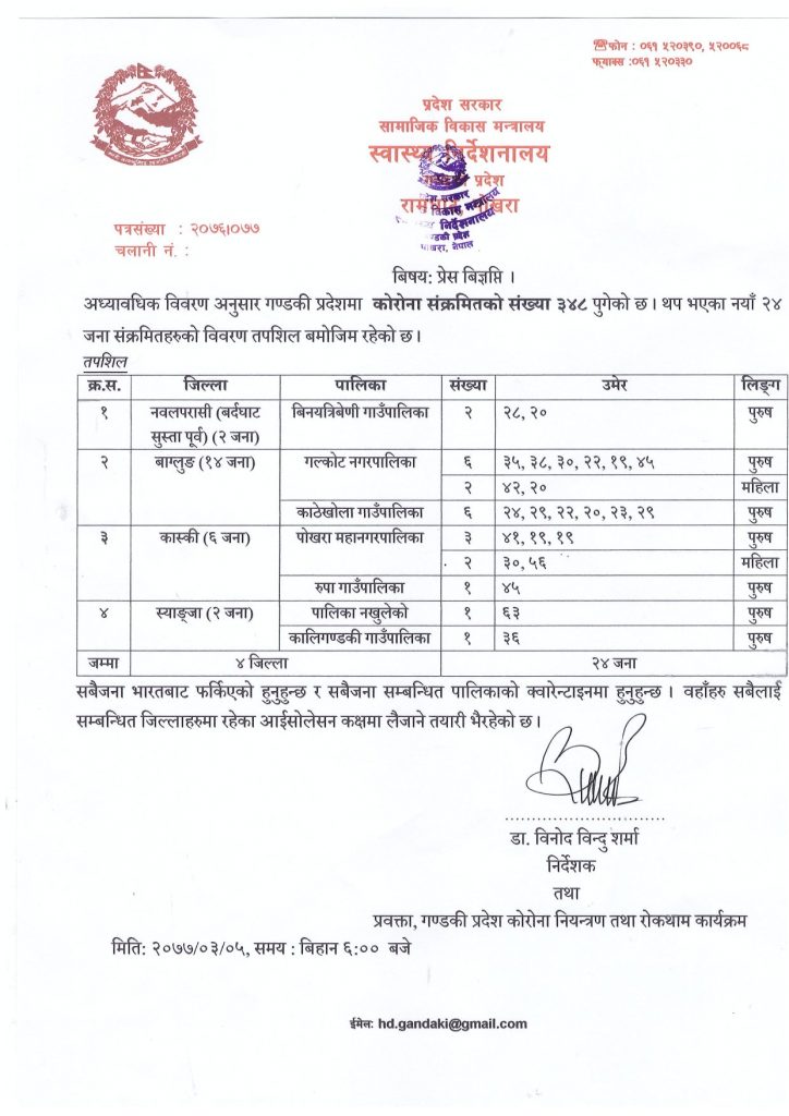 कास्कीमा शुक्रबार बिहान थप ६ जनामा कोरोना संक्रमण पुष्टि भएको छ । अब गण्डकी प्रदेशमा कोरोना संक्रमितको संख्या ३ सय ४८ पुगेको छ ।