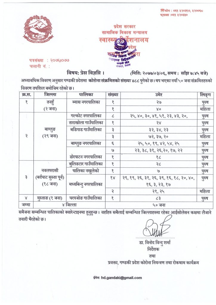 नवलपरासीमा १८, बागलुङमा २९ र तनहुँमा २ जनामा कोरोना पुष्टि भएको छ । अब गण्डकीमा संक्रमितको संख्या ४ सय ८८ पुगेको छ ।