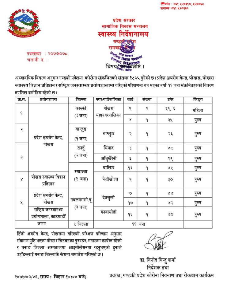 यस्तै, पोखरा ४ का ३५ वर्षका पुरुषमा पनि संक्रमण पुष्टि भएको छ । अब गण्डकी प्रदेशमा कोरोना संक्रमितको संख्या १८५५ पुगेको छ ।