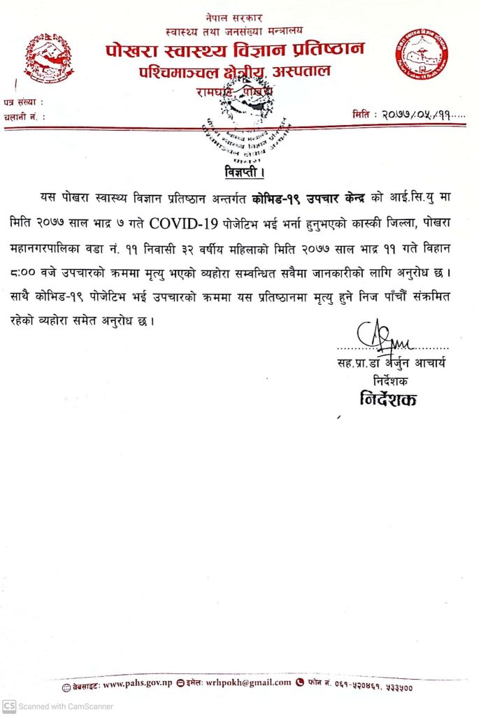 अस्पतालको आईसियुमा उपचाररत पोखरा महानगरपालिका ११ की ३२ बर्षिया महिलाको मृत्यु भएको पोखरा स्वास्थ्य विज्ञान प्रतिष्ठान पश्चिमाञ्चल क्षेत्रीय अस्पतालका निर्देशक डा अर्जुन आचार्यले बताए । भदौ ७ गते उपचारका लागि अस्पताल आएकी उनको बिहीबार बिहान ८ बजे मृत्यु भएको हो ।