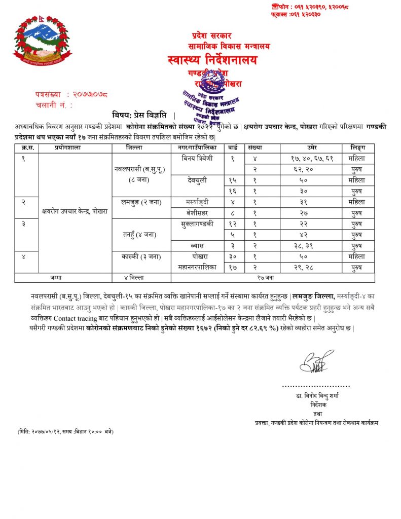 निर्देशनालयले क्षयरोग उपचार केन्द्र, पोखरा गरिएको परिक्षणमा गण्डकी प्रदेशमा १७ जना संक्रमित थपिएको जनाएको हो । अब गण्डकी प्रदेशमा कोरोना संक्रमितको संख्या २ हजार २२ पुगेको छ ।