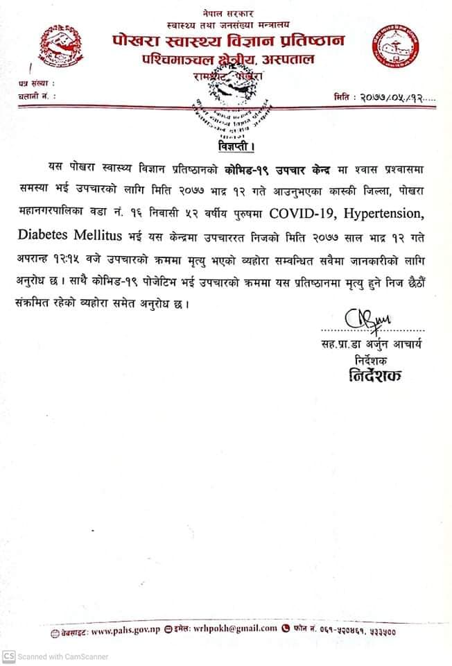 बिहीबार पोखरा १२ की ३२ वर्षीया संक्रमितको मृत्यु भएको थियो । आज मृत्यु भएका