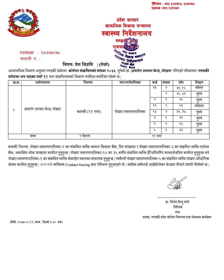पोखरा महानगरमा फेरि ११ जनामा कोरोना पुष्टि भएको छ । प्रदेश स्वास्थ्य निर्देशनालयको तेस्रो अपडेटमा थप ११ जनामा संक्रमण पुष्टि भएको हो ।