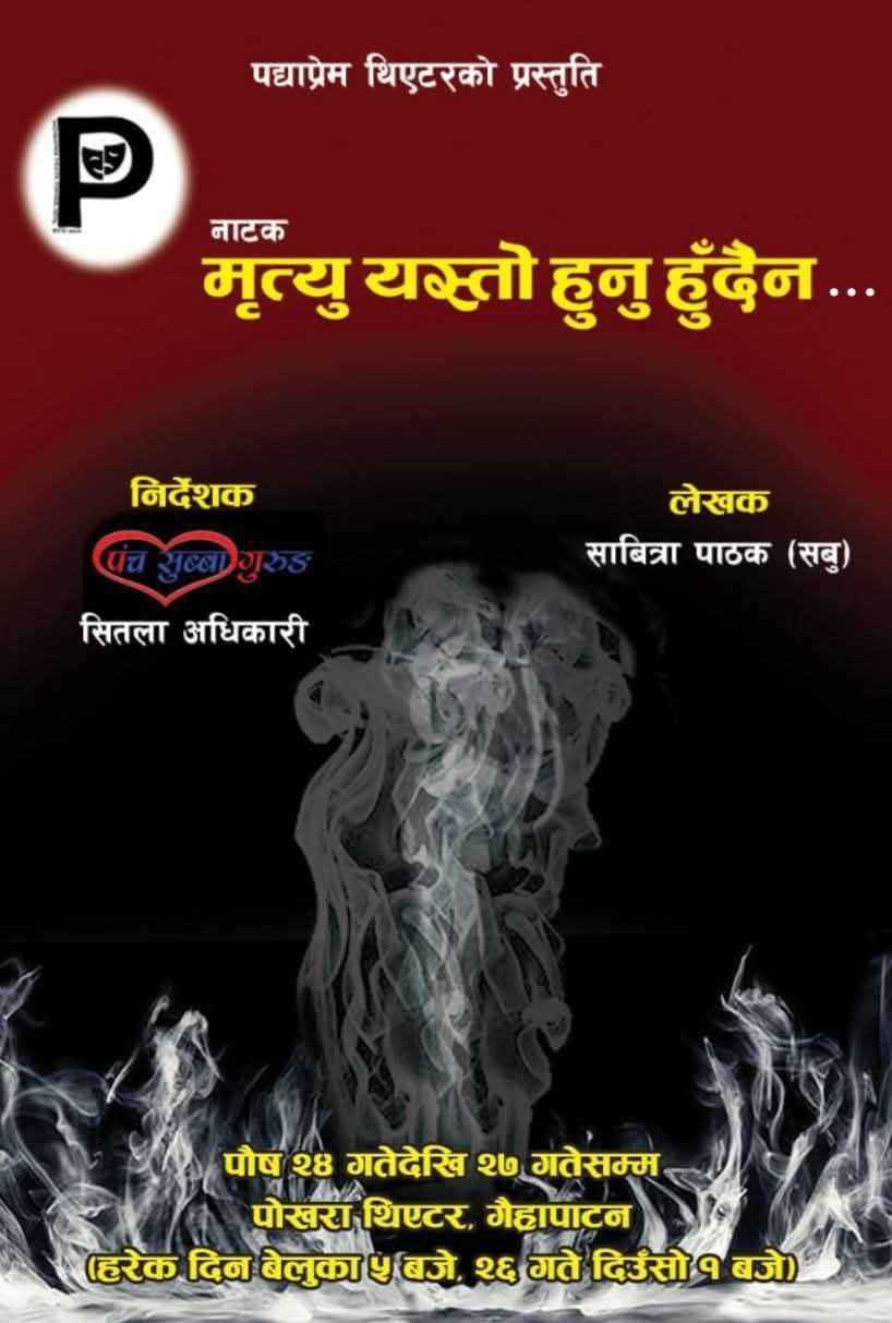 पोखरामा मदिरा तथा लागुपदार्थ दुव्र्यसनले निम्न मध्यमवर्गीय परिवार र युवाको जीवनमा पारेको गम्भीर असर उजागर गर्ने नाटक ‘मृत्यु यस्तो हुनु हुँदैन…’ मञ्चनको तयारीमा छ । पद्याप्रेम थियटरको प्रस्तुतिमा तयार भएको यो नाटक सावित्रा पाठक (सबु)ले लेखेकी हुन् भने निर्देशन पञ्चसुब्बा गुरुङ र शीतला अधिकारीले गर्दै छन् ।