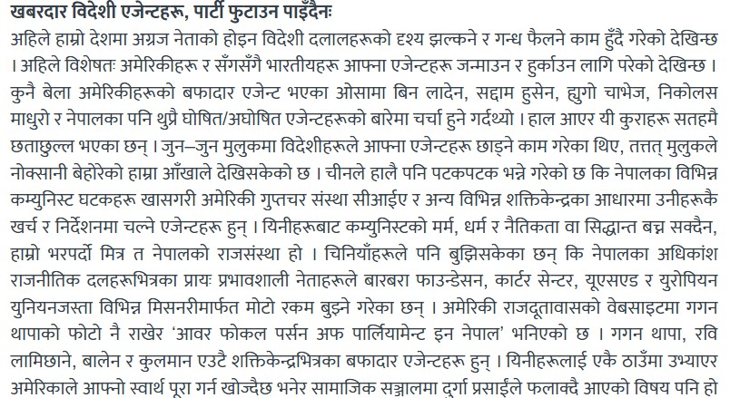बाबुराम, प्रचण्ड, रवि, बालेन वा महावीर जेसुकै नाम दिइए पनि समग्रमा यिनीहरू इण्डो–पश्चिमाहरूले खुवाएका वा हुर्काएका एजेन्टहरू नै हुन् जसलाई नेपाल दोहन गर्न खटाइएको बुझिन्छ ।