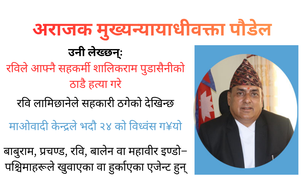 यसरी कर्तव्य बिर्सिएर नेताहरुलाई प्रमाणबिनै संगीन आरोप लगाउने उनका हरेक लेखको पुछारमा वरिष्ठ अधिवक्ता पौडेल गण्डकीका मुख्यन्यायाधीवक्ता हुन् लेखिएको छ । गण्डकीका मुख्यमन्त्री सुरेन्द्रराज पाण्डेले यस्ता अनैतिक र पूर्वाग्रही मुख्यन्यायाधीवक्तालाई बर्खास्त गर्छन् वा संरक्षण गर्छन्, समयले देखाउनेछ ।