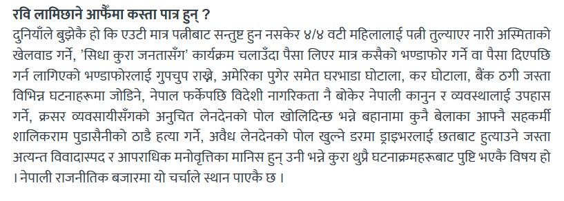 दुनियाँले बुझेकै हो कि एउटी मात्र पत्नीबाट सन्तुष्ट हुन नसकेर ४/४ वटी महिलालाई पत्नी तुल्याएर नारी अस्मिताको खेलवाड गर्ने, सिधा कुरा जनतासँग कार्यक्रम चलाउँदा पैसा लिएर मात्र कसैको भण्डाफोर गर्ने वा पैसा दिएपछि गर्न लागिएको भण्डाफोरलाई गुपचुप राख्ने, अमेरिका पुगेर समेत घरभाडा घोटाला, कर घोटाला, बैंक ठगी जस्ता विभिन्न घटनाहरूमा जोडिने, नेपाल फर्केपछि विदेशी नागरिकता नै बोकेर नेपाली कानुन र व्यवस्थालाई उपहास गर्ने, क्रसर व्यवसायीसँगको अनुचित लेनदेनको पोल खोलिदिन्छ भन्ने बहानामा कुनै बेलाका आफ्नै सहकर्मी शालिकराम पुडासैनीको ठाडै हत्या गर्ने, अवैध लेनदेनको पोल खुल्ने डरमा ड्राइभरलाई छतबाट हुत्याउने जस्ता अत्यन्त विवादास्पद र आपराधिक मनोवृत्तिका मानिस हुन् उनी भन्ने कुरा थुप्रै घटनाक्रमहरूबाट पुष्टि भएकै विषय हो । नेपाली राजनीतिक बजारमा यो चर्चाले स्थान पाएकै छ । अहिलेका रास्वपाका सभापति बनाइएका रवि लामिछाने व्यक्ति एक तर रुप र ठेगाना अनेक देखाएर सहकारीबाट रकम अपचलन गरेको देखिन्छ ।
