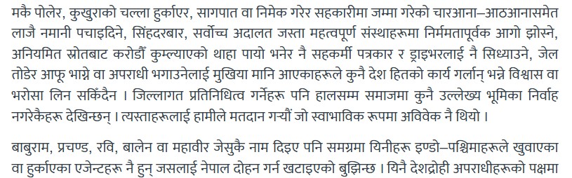विगतमा मुलुकलाई हत्या र हिंसाको चपेटामा गिजोलेर आएको भारतीय कम्युनिस्ट पार्टीभन्दा फरक नपर्ने नेकपा माओवादी केन्द्रका केही जल्लादले लुटेको सम्पत्तिले उचालिएर नपुगेर गत भदौं २३ र २४ को राज्य आतंक फैलाउन आफ्ना आसेपासेहरूलाई मैदानमा उता¥यो ।